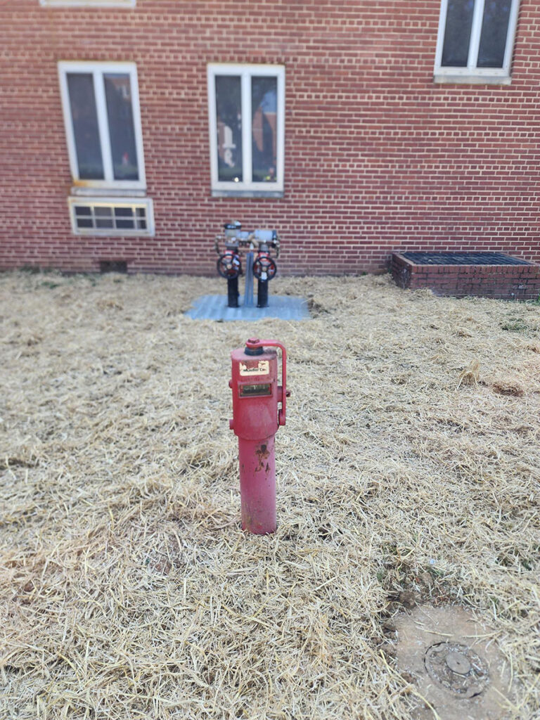 Additionally, the project includes underground utility work. Utility locates and trenching between the existing Post Indicator Valve (PIV) and Building 13 are provided. A hot box will be installed outside the building to house the fire line’s Reduced Pressure Zone (RPZ) backflow preventer. A new 6” ductile iron fire main will feed the building via its crawlspace.